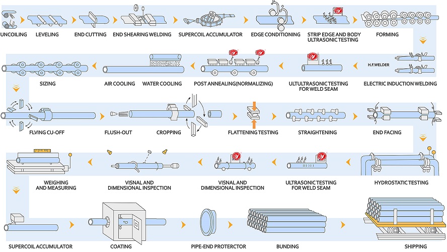 Raw material→Uncoiling→Shearing and butt welding→Vertical material accumulator→Material flattening→Feeding→Roll forming→High frequency induction welding→Removing outer burr→Water cooling→Pipe shape and size adjusting→Computerized flying saw→Pipe automatic unloading and packing